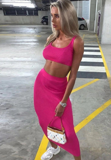 Summer knitted vest open navel short slim solid high waist skirt two piece set
